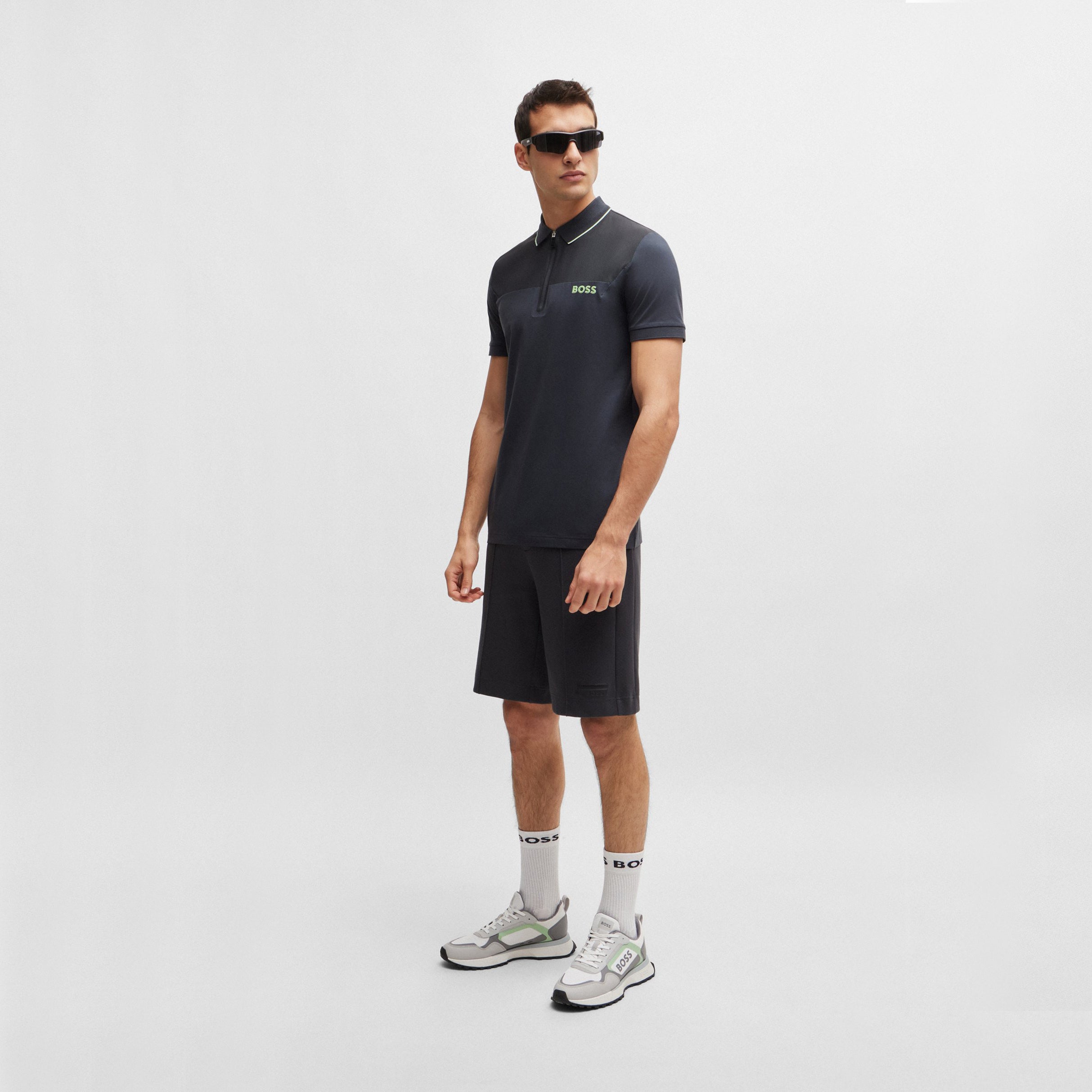 A modern polo shirt cut to a slim fit in stretch-cotton jersey with a zip placket, mesh insert and mesh logo detail by BOSS Menswear.