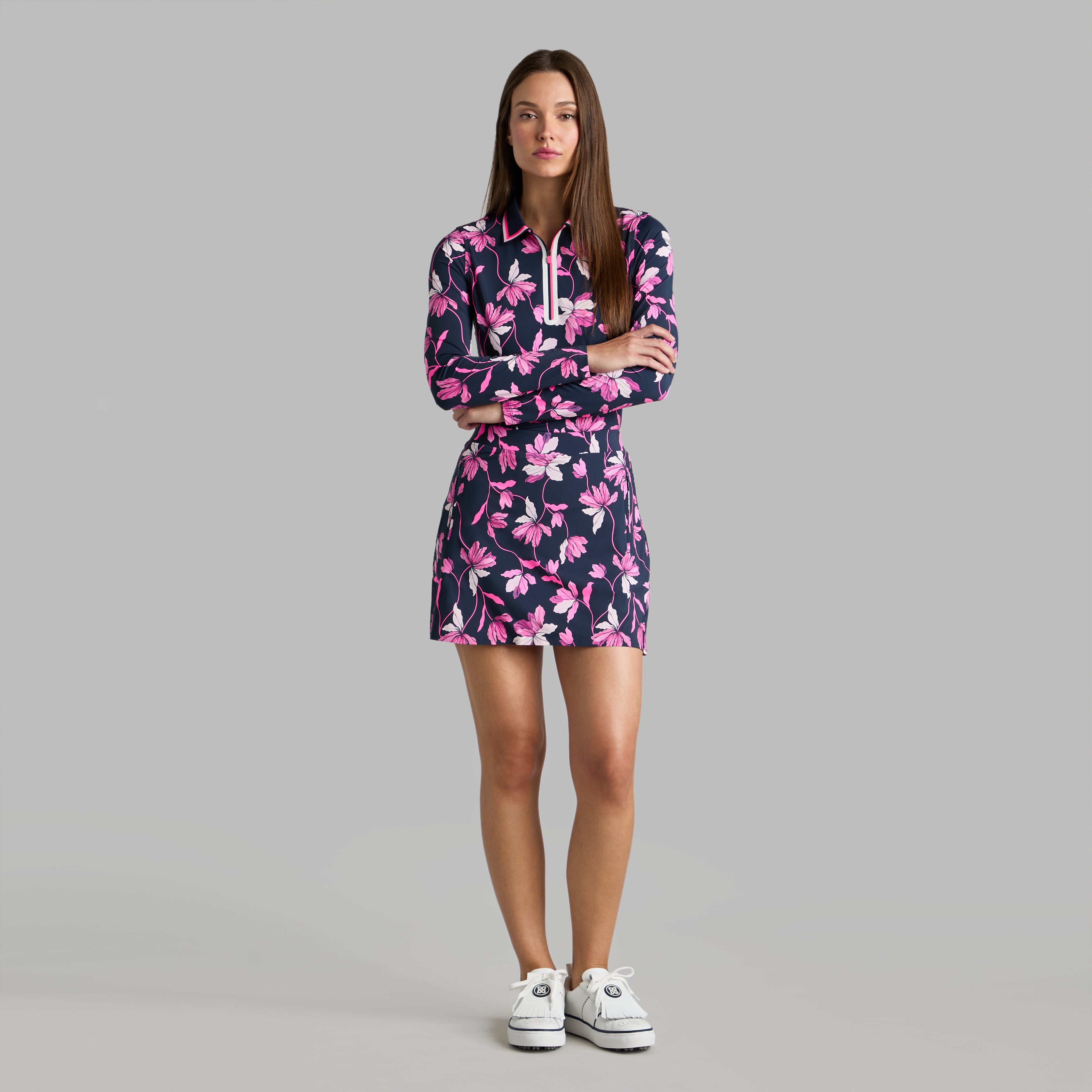 OUR SILKY TECH NYLON SKORT IN OUR FUN IRIS PRINT IS THE PERFECT PAIRING PIECE FOR ANY TOP IN YOUR WARDROBE. MOISTURE-WICKING AND MADE WITH UPF, THIS TREND-SETTING SKORT FEATURES INTERIOR SILKY TECH NYLON SHORTS EQUIPPED WITH A COOLING EFFECT FOR ALL DAY COMFORT — TAKING YOU FROM PUTTING BALLS ON THE GREEN TO RUNNING ERRANDS AROUND TOWN. PAIR YOURS WITH THE MATCHING LONG SLEEVE POLO FOR THE ULTIMATE SET. DETAILS MADE WITH EXTREMELY LIGHTWEIGHT SILKY TECH NYLON ZIPPERED SIDE POCKETS TO EASILY STORE GOLF BALLS & PERSONAL BELONGINGS SILICONE CIRCLE G'S LOGO NEAR THE HEM DESIGNED WITH 4-WAY STRETCH FOR ULTIMATE MOBILITY MOISTURE-WICKING TO KEEP YOU FRESH & DRY UPF 50+ FOR AN ADDED LAYER OF DEFENSE COOLING EFFECT IDEAL FOR WARMER DAYS FIT Hyunjoo is 5'9 & wearing a size X-Small IN TWILIGHT. MATERIAL 78% NYLON / 22% ELASTANE