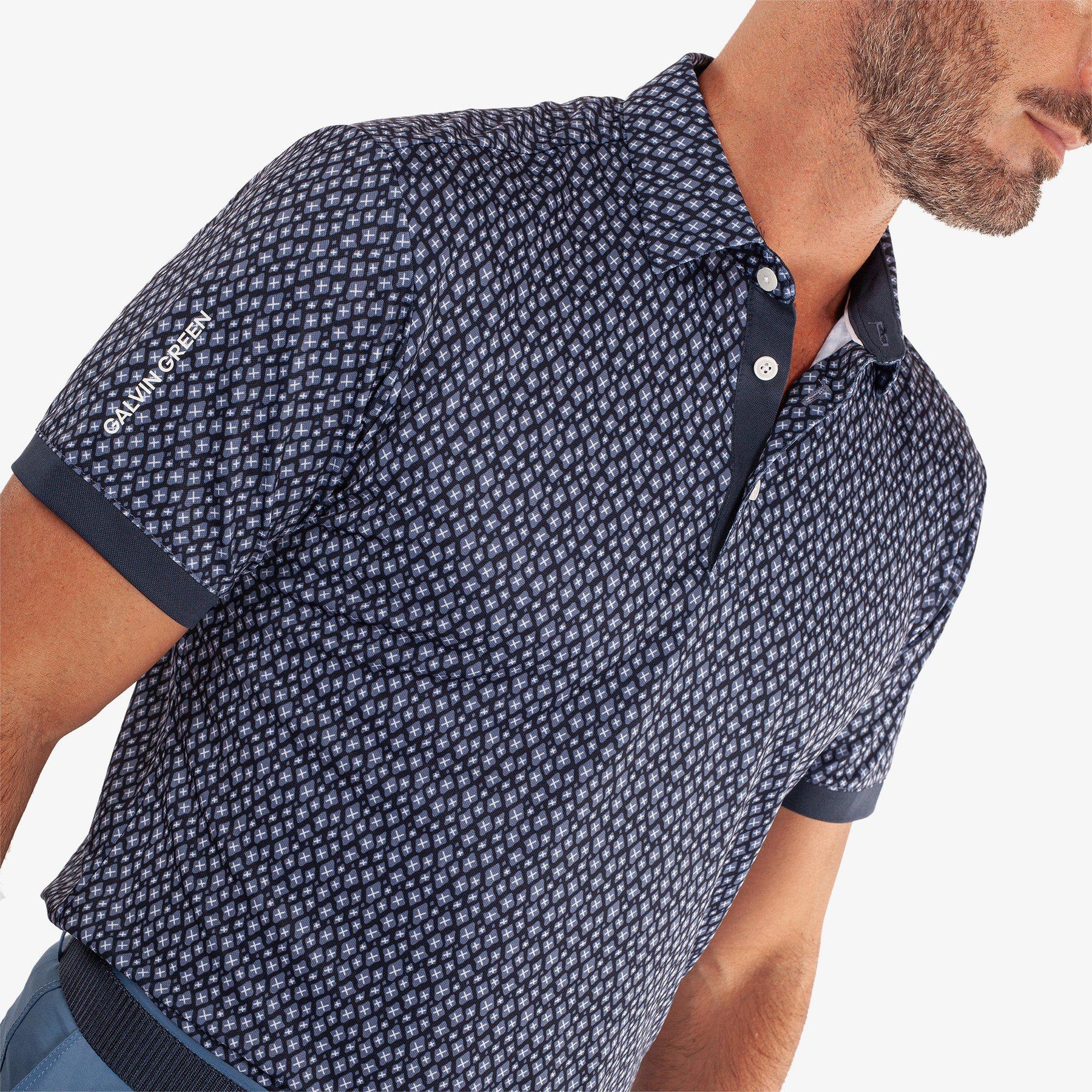 The Galvin Green Manuel Golf Shirt brings a modern twist to classic golf apparel by blending argyle, floral, and fluid shapes into a dynamic all-over print. Designed for both style and performance, this shirt is crafted from VENTIL8™ PLUS fabric, providing exceptional breathability, moisture-wicking properties, and quick-drying comfort to keep you at your best throughout the day. Featuring UV protection (20+), a tailored collar, and sleeve end cuffs, the Manuel golf shirt ensures a refined, structured look while allowing unrestricted movement on the course.