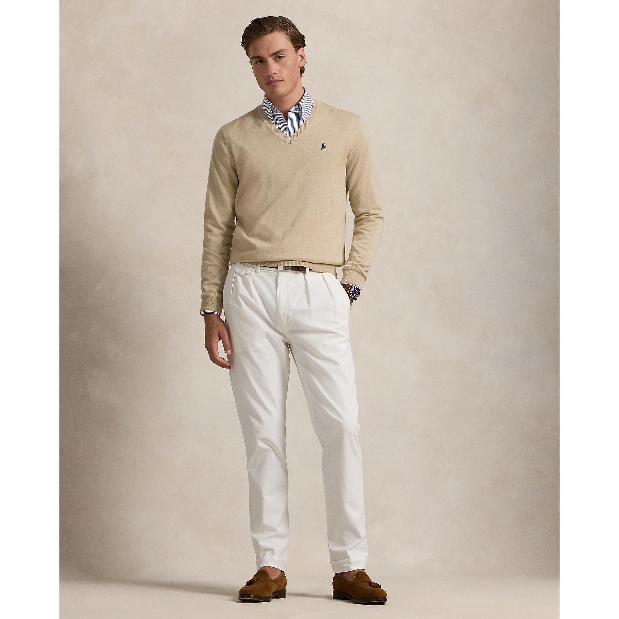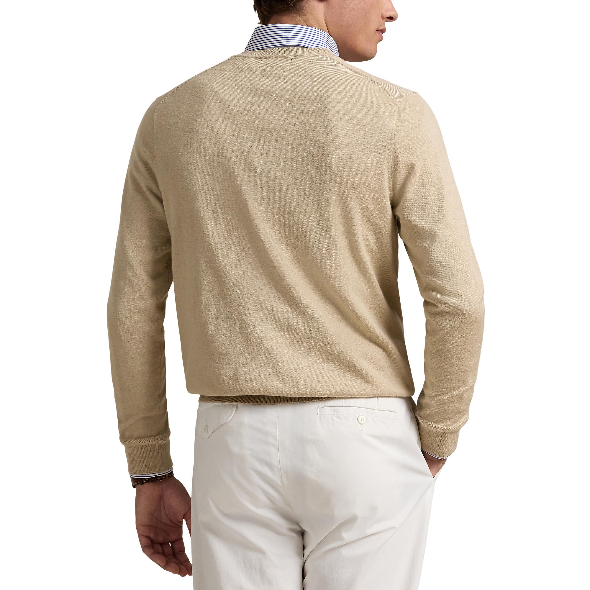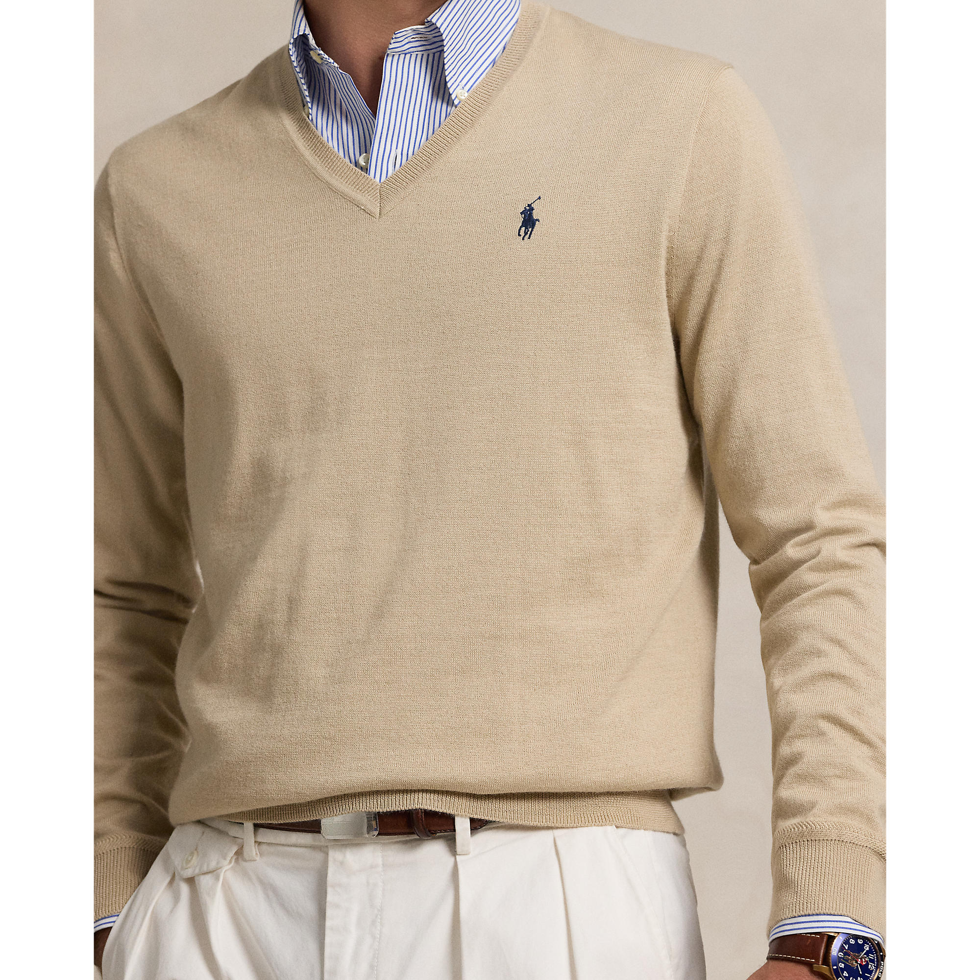 Effortless Style, Maximum Comfort Polo Performance Ralph Lauren Performance V-Neck Golf Sweater – Basic Sand Add a touch of class to your golf game with the Polo Performance Ralph Lauren Performance V-Neck Golf Sweater in Basic Sand. Made with a recycled polyester blend containing worsted wool and COOLMAX® fibers, this sweater is designed to keep you cool, dry, and comfortable by wicking moisture away from your body.