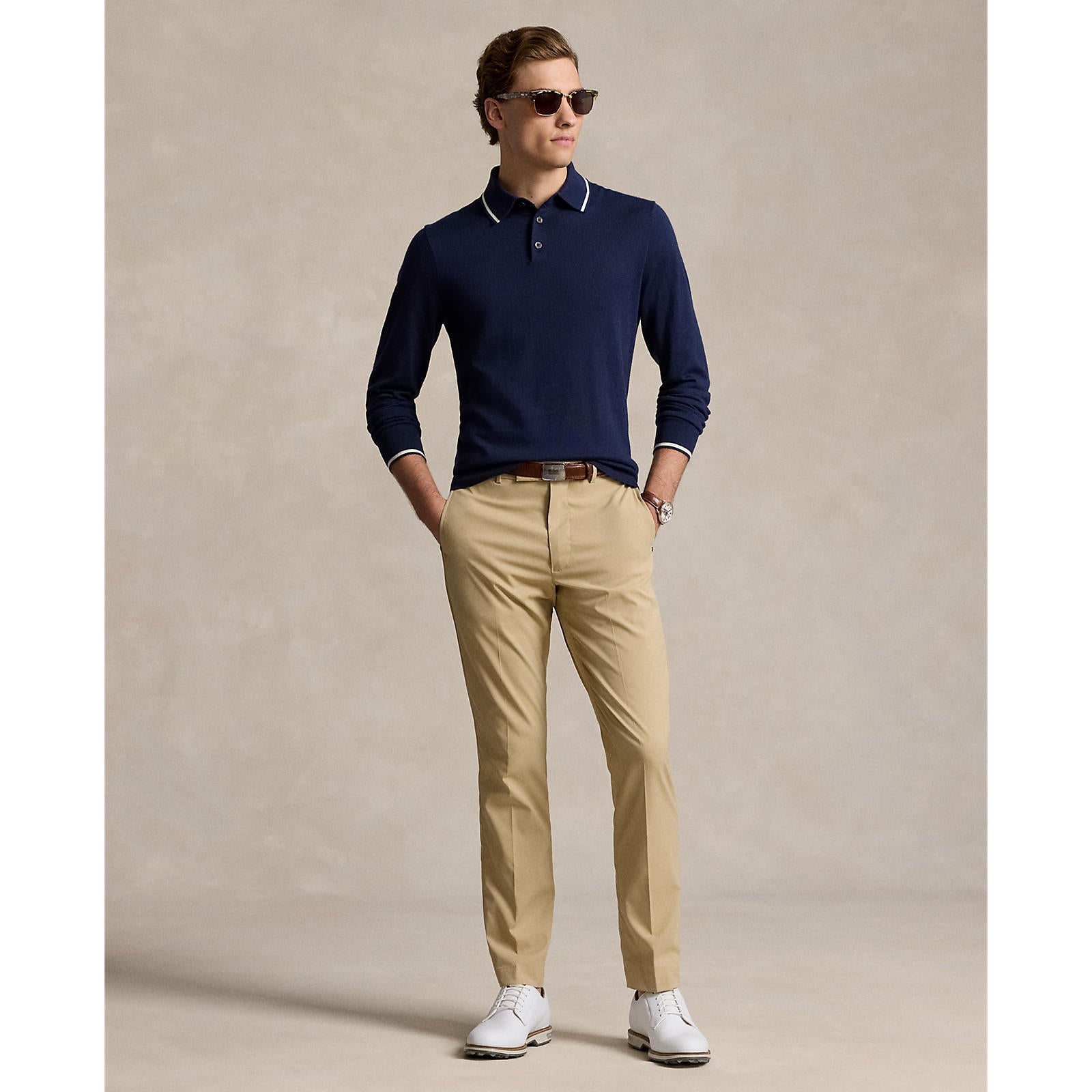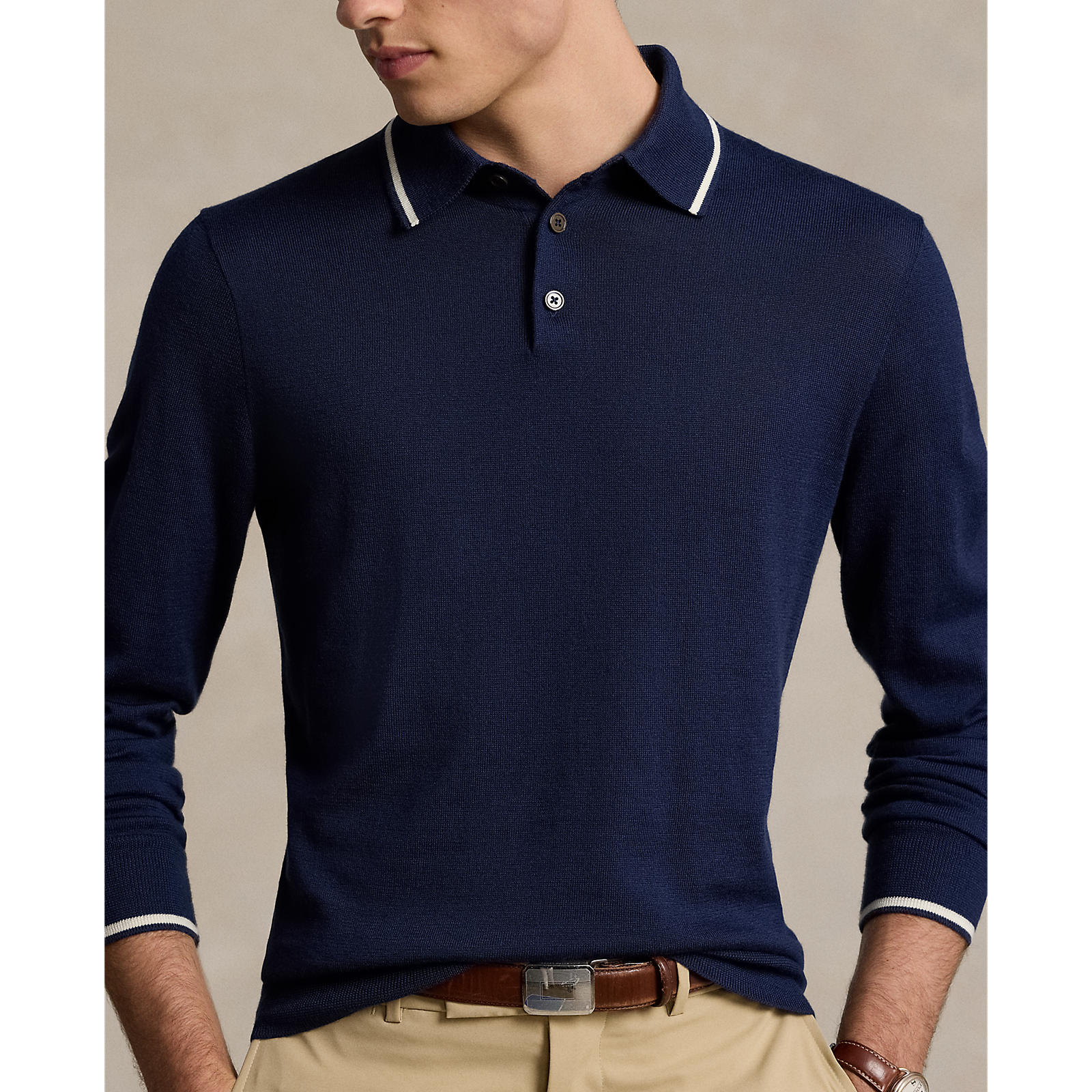 Key Features: -Tailored Fit: Size medium features a 26.75" body length, 17.5" shoulder width, 42" chest, and 25.75" sleeve length (sleeve length increases by 0.5" between sizes). -Refined Design: A rib-knit polo collar with contrast tipping and a three-button placket offers a polished, classic look. -Premium Details: Crafted with genuine mother-of-pearl buttons for an elevated finish. -Comfort & Flexibility: Long sleeves with rib-knit cuffs and hem, both featuring contrast tipping, ensure a sleek yet comfortable fit. -Signature Branding: The embroidered "RLX" logo at the center back neck adds a premium touch. -Performance Fabric Blend: Made from a breathable, moisture-wicking mix of 55% polyester and 45% wool, keeping you warm yet dry. -Easy Care: Machine washable for convenience. -The model is 6'1" (185 cm) and wears a size medium.