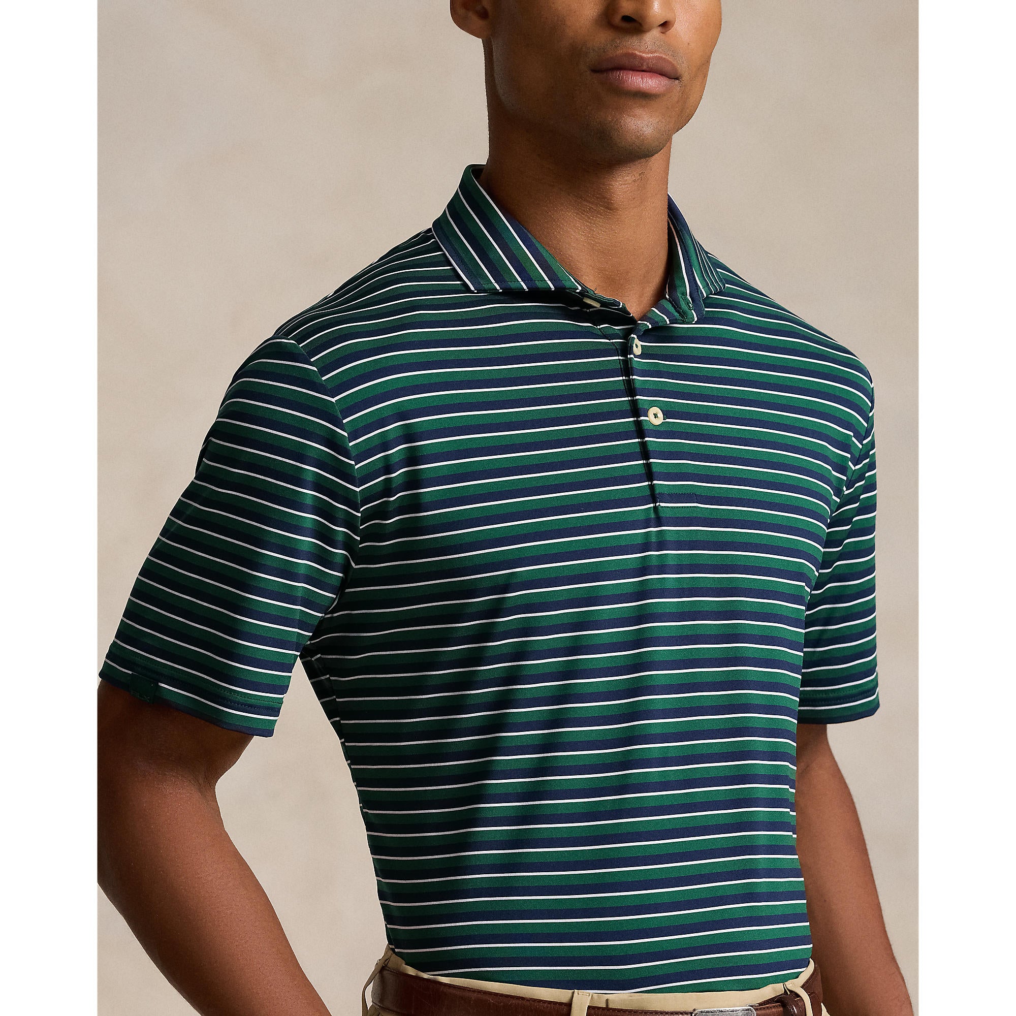 Breathable Comfort with Timeless Stripes The RLX Ralph Lauren Stripe Lightweight Airflow Golf Polo Shirt in New Forest Multi blends classic style with modern performance. Crafted from lightweight stretch jersey, this polo features moisture-wicking technology to keep you cool, dry, and comfortable throughout your round. The timeless striped design ensures a polished look on and off the course.