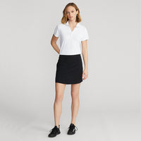 -Straight fit. -Intended to hit at the mid-thigh. -Skirt length changes ½" between sizes. -Elasticized waist. -Two front angled pockets. -Back right welt pocket. -Attached interior short. -Perforated side panels. -RLX printed at the front right hem. -Curved hem. Perforated back yoke. -Back darts. -Shell and interior short: polyester, elastane.