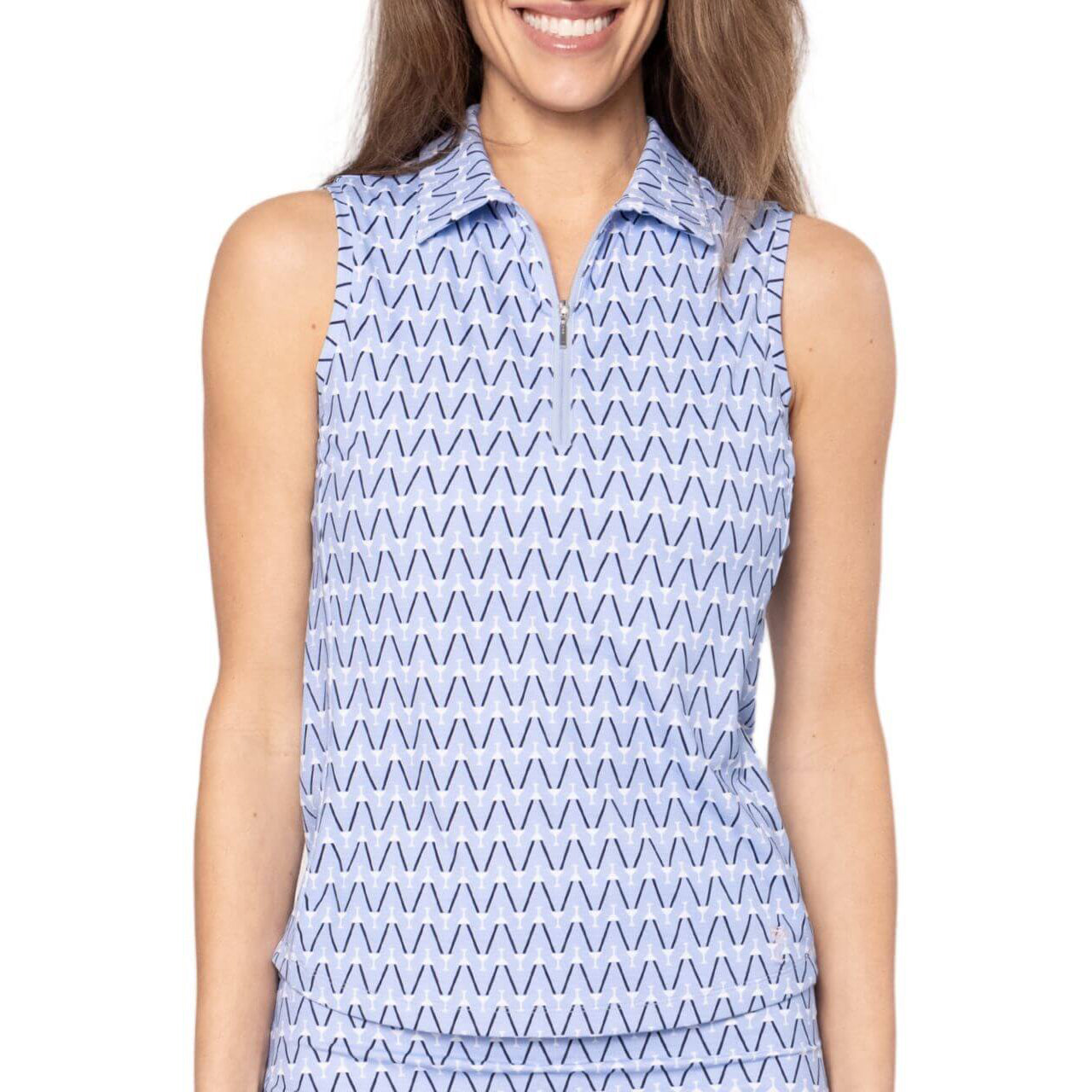 Golftini女子酷女孩Nauti和漂亮的无袖运动马球将别致的风格与高性能设计结合在一起。这种马球采用嬉戏的蓝色,白色和海军马提尼酒的印刷品,由轻巧的,吸湿的织物制成,可让您在整个过程中保持凉爽和舒适。女性公主接缝和1/4拉链可提供讨人喜欢的合身性,而UPF 30多个防晒和无皱纹的性能使其成为晴天的实用选择。